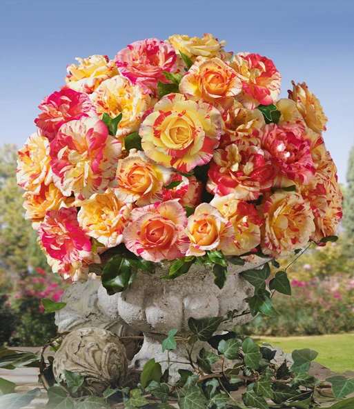 Pure opwinding! Geen bloem is gelijk!! Met elke nieuwe knop begint de onvermoeibare kleurverandering van deze gezond groeiende plant. De bloemen van de schildersroos® Camille Pissaro® verschijnen als glanzende druppels met harmonieus vloeiende kleuren. Een echt kleurenjuweeltje van de natuur, vergezeld van een fruitig frisse geur. De schildersroos® Camille Pissaro® toont haar creativiteit tot de eerste nachtvorst. Een lust voor het oog! Elke dag! De schildersroos® ruikt naar mandarijn, komkommer, aalbes en kers.