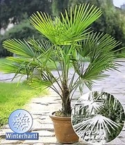 De winterharde Chinese waaierpalm is een groenblijvende potplant, die voor een mediterrane flair in de tuin, op het balkon en terras zorgt. De waaierpalm kan ook tegen lage temperaturen onder het vriespunt (tot -15° C) en kan daarom in de winter buiten blijven staan! De winterharde Chinese waaierpalm, ook als Chinese henneppalm bekend, is met haar kroon van donkergroene waaiers een sieraad in de pot en het tuinperk. Topkwaliteit! (Trachycarpus fortunei)